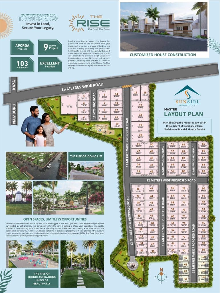 The Rise Open Plots, a premium gated community with meticulously planned villa plots in a prime location. Designed for a balance of nature and modern living, it offers seamless connectivity to urban conveniences. With world-class infrastructure, secure surroundings, and green open spaces, it ensures a high-quality lifestyle. Key features include 40-feet CC roads, underground electricity, rainwater harvesting, and 100% Vaasthu compliance. Bank loans are available, making your dream investment effortless.