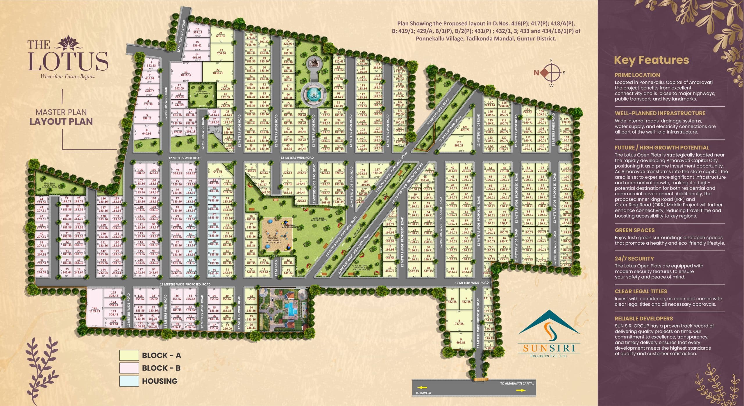 Welcome to Sunsiri The Lotus, a DTCP-approved gated community designed for a modern and peaceful lifestyle. Located in a prime area, this project offers well-developed infrastructure with wide 60 & 40 feet blacktop roads, an underground drainage system, and a reliable electricity supply. With 100% Vastu compliance, the layout is thoughtfully planned to enhance positive living. Additionally, 70% bank loan availability makes homeownership more accessible. Experience a secure, serene, and comfortable environment, enriched with premium amenities and lush green surroundings.